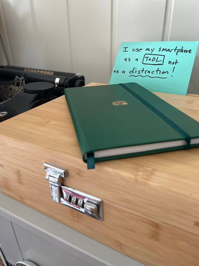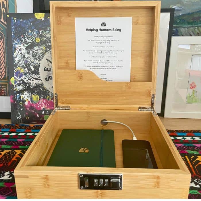 A physical bamboo lockbox + premium hard cover 88-page journal with everything you need to transform your smartphone habits for the long term, including: